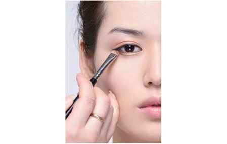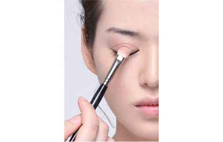 第四步:眼影颜色选择暖色系的哑光大地色最好,用平涂的手法晕染在上眼皮的虚线范围内。