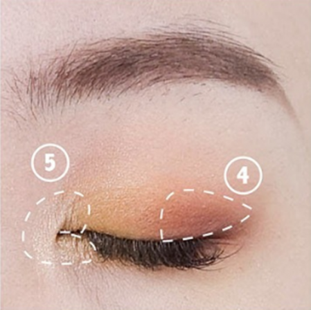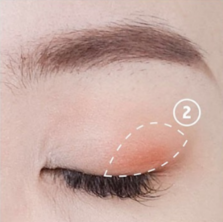 Step2 然后取一橘色眼影,涂抹在上眼皮眼尾的三角区域。