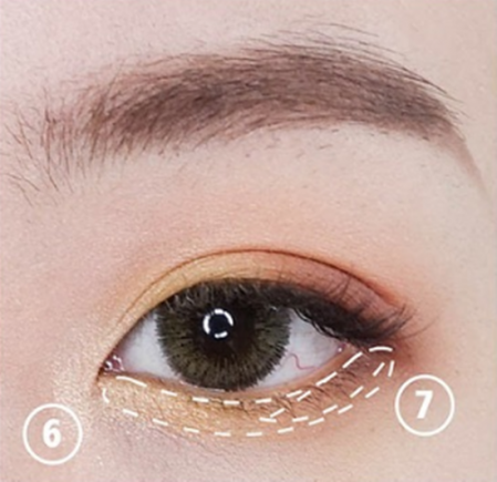 Step5 接下来取**眼影,涂抹在下眼皮前半段。再取橘色眼影,晕染在下眼皮后半段。