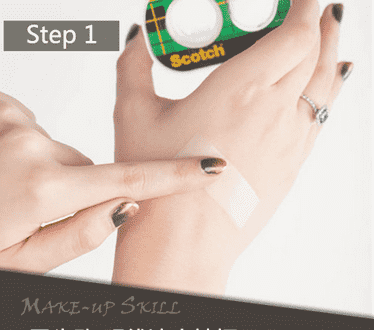 Step 1:取一小段透明胶,将其在手背反复黏贴几次,减少它的粘性,从而待会在眼部使用时,能减少透明胶因为粘性太重而伤害眼部脆弱的肌肤。