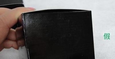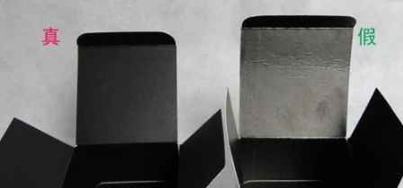 4、拆开以后,发现柜台买的,纸盒很黑,反光不强烈。右边的则不是纯黑,发金,发乌,做工也粗糙。