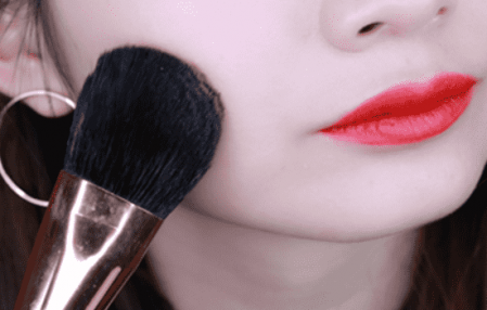 第六步:选择正红色唇膏,唇部打底后用唇刷沾取唇膏勾勒唇线,然后用口红满涂即可。