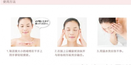 双手上的珂润卸妆啫喱在脸部以螺旋状抹开来,以此充分溶解掉脸部的淡妆和污垢;注意珂润卸妆啫喱不太适合卸眼妆,卸妆力较差,眼妆可用眼部卸妆产品单独去卸除。