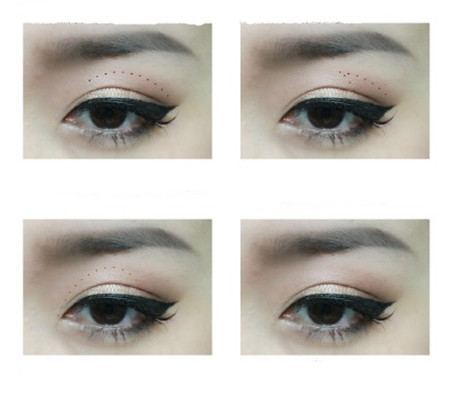 第三步:用手指将眼影铺在眼皮前半段,并用晕染刷晕染边缘。用眼线笔画上段的内眼线。眼线液笔画猫眼眼线,然后将透明胶带撕掉。
