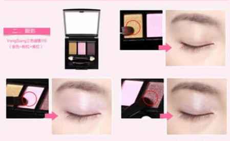 步骤3:使用金色亮片眼影打亮整个眼窝,颜色稍微淡些;然后使用粉色的眼影涂抹在眼窝处,要与金色自然融合;再使用紫红色的眼影涂抹在下眼睑眼尾处的1/3。