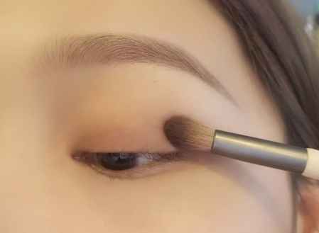同样的,也是先将浅豆沙色的眼影涂抹到眼窝处做一个打底处理。浅豆沙打底的眼妆看起来温柔感会强一点,香槟色打底的眼妆看起来会更加百搭一点。