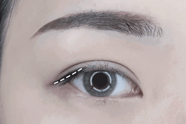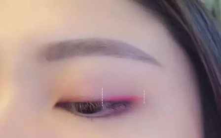 如下图所示,有两条虚线,先用红色的眼线笔沿着睫毛根部连接这两条虚线,画好一条半条眼线。