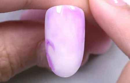完成白色打底后照干。为了让颜色更好的晕染开,我们为甲面刷上一层封,暂时不用照干。把紫色甲油胶与封层调稀,用小笔沾取后,描绘甲面后端的边缘,接着把颜色往內沿晕染开,注意颜色不需要太均匀,深浅不一会更好看哦!