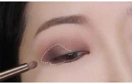 第二步:用锥形刷沾取偏紫的棕色眼影画在图中虚线范围内。