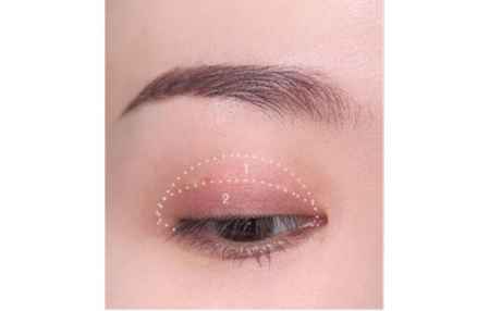 第一步:用大号眼影刷沾取一个浅色打底哑光色眼影画在图中1的范围,再用眼影刷沾取一个紫红色的眼影画上图中2的范围。