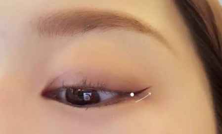 先闭眼,用眼线笔在眼线上方0.5cm处,画一挑自然的弧线,然后用眼线笔填充弧线以下,眼线以上的位置。如上图动图所示,眼尾可以稍稍上扬延长一点。