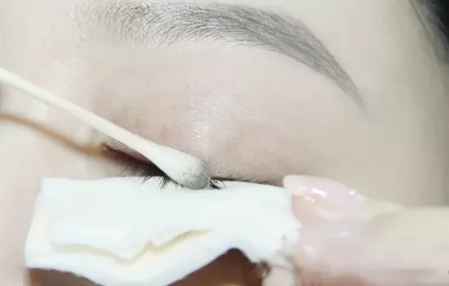 第三步:拿出一张新的化妆棉对折,垫在睫毛下方,也就是上下眼睑中间,用一个棉签沾取眼唇卸妆液,从睫毛根部向外轻擦睫毛。