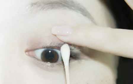 第四步:用小指轻压翻起上眼睑,接着使用沾湿卸妆液的棉签清洁睫毛根部的残留眼线,这样眼妆就算是卸完了,只有这样卸眼妆,才会是最干净的,而且对眼部伤害和刺激最小。