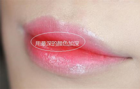 第三步:用颜色最深的一面,在嘴唇内侧做一个颜色的加深。