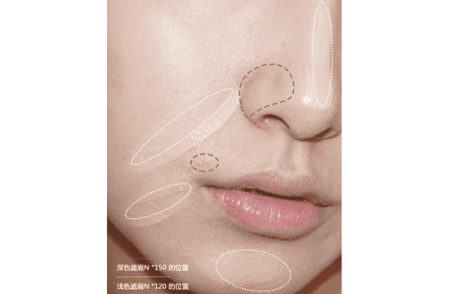 接着使用120浅色提亮法令纹、下巴、鼻梁的位置,深色遮瑕用海绵头轻轻地点一下痘痘以及鼻翼泛红的位置,接着用海绵蛋或者指腹轻轻拍开即可。