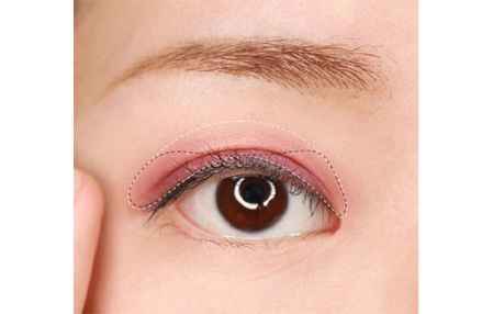 第二步:将一个红色眼影沿着睫毛根部画在上眼皮褶皱内,范围是黑色虚线的部分,再用指腹晕染开到白色虚线的范围。