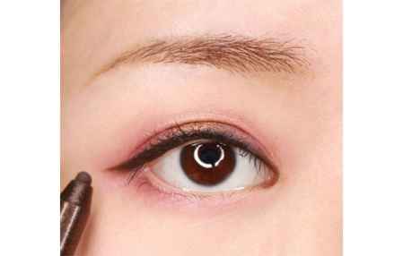 第四步:用棕色的眼线胶笔画一条眼线,眼尾适量拉长,棕色的眼线笔其实会比黑色的更加自然,也更柔和一下。
