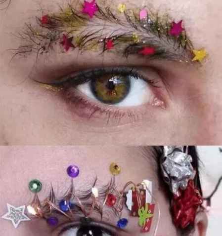 圣诞的眉妆,就是将眉毛化成圣诞树的样子,看着就很像圣诞树,加上补贴色彩的点缀,虽然看起来是有些奇怪,但却不得不承认是很有节日气氛,看多几眼会有些**了。