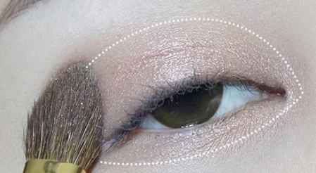 第三步:大号眼影刷沾取珠光咖色眼影铺满上下眼皮,作为眼部打底之用。