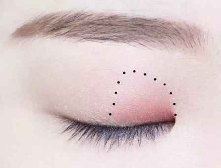 STEP2:金粉色的眼影在图中虚线内晕染,将重点放在靠近睫毛根部的地方,越到上面颜色越浅。