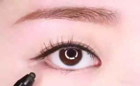 Step 2:用黑色眼线笔沿着上睫毛根部画一条眼线,眼尾适当拉长上扬。