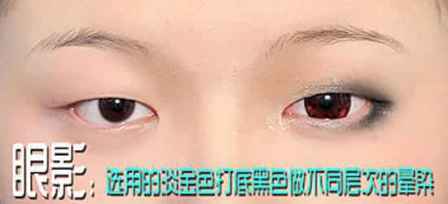 步骤二:眼影这里的画法是类似烟熏妆眼影的,因此选用了眼影选用的淡金色打底,黑色做不同层次的晕染。这样才能使得双眼更加突出。