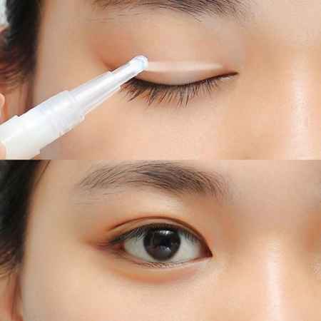 2、从睫毛根部4~6毫米以上的眼睑部位化出双眼皮纹路最自然眼睛往下看,将胶水涂抹出以划出的双眼皮纹路为中心4~6毫米宽的椭圆状。千万不要睁开眼睛过2分钟,等胶水从白色变成半透明色,用推动棒压出双眼皮的同时慢慢睁开眼睛。