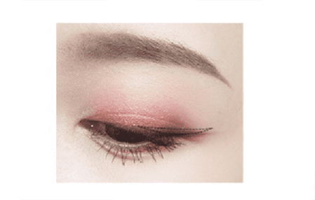 Step6 最后取玛丽黛佳网红九宫格眼影第三排的最后色,沿着上眼皮睫毛根部画一自然的眼线。再将上下睫毛夹卷,涂上睫毛膏就可以了。
