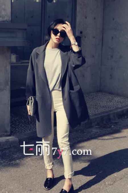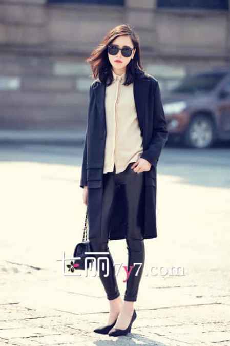 搭配看点:长款休闲西装很容易穿出气场,不过也很容易显得沉闷,尤其是深色系。建议内搭浅色衬衣,时下比较流行简约风尚,所以衬衣的款式越简洁越大气。下搭黑色皮裤和尖头高跟鞋,气场强大不能忽视,适合职场lady穿搭,也可以将西装换成短款更显精致。