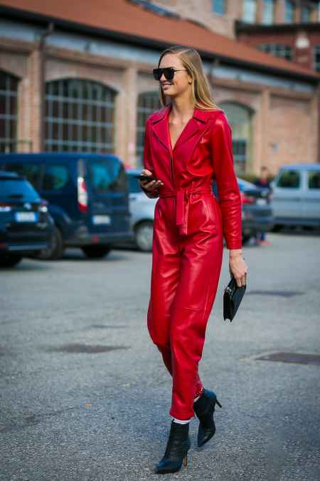 帅气的连体裤搭配一只黑色手拿包,两者风格相得益彰。红色和黑色的组合在时尚圈也非常多见,红色的热情抢眼被低调的黑色中和,才不会显得过于花哨。