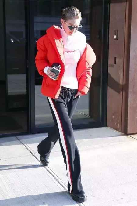 GiGi这身搭配保暖又舒适,黑色的校服裤搭配黑鞋让她更加凸显高级感,而且更显腿长!