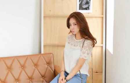 雪纺蕾丝透明短袖+浅蓝色牛仔裤