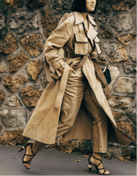 长款的外套包括风衣,长款的罩衫等,笔挺的材质可以很好地掩盖身材比较臃肿的部位,下装可以搭配高腰的阔腿裤与尖头高跟鞋,展示优雅成熟的职场女性气质。