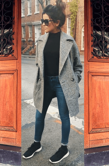 灰色呢子大衣+黑色针织上衣+蓝色牛仔裤+白底黑色运动鞋