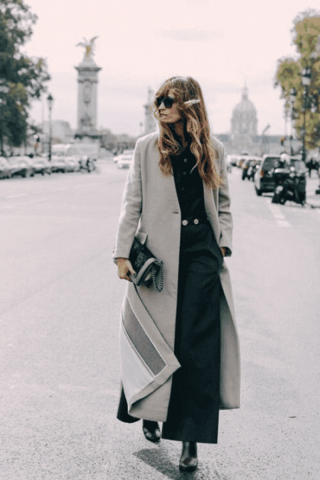 黑灰色系的大衣与毫无色彩偏向的同色系配搭,会给人一种优雅内敛而不失简约大气的印象,黑色的呢子大衣优雅而沉稳,与灰色高领毛衣的配搭更显温柔。小脚裤与短靴又增添一丝俏丽。