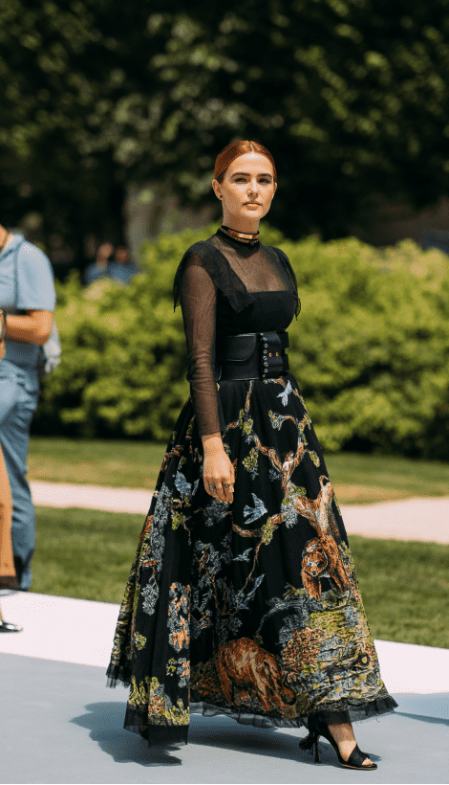 黑色欧根纱印花高腰连衣裙+黑色皮质腰封