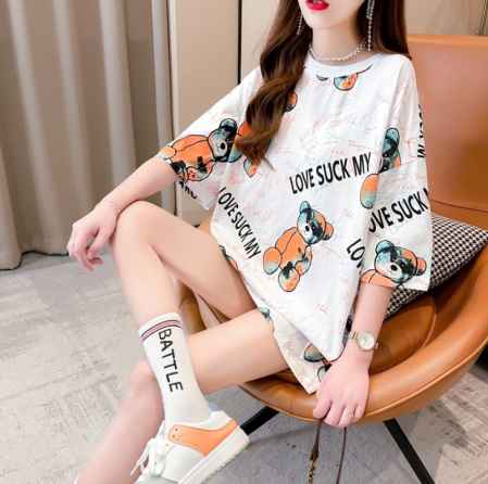 长款t恤我们可以在下面穿一个那种超短裤,其实就是那种下装失踪的穿法, 不过这个关键的一点就是**腿不能够太粗不然就很不好看了,或者长款t恤搭配宽松的牛仔裤也是可以的,这样**又减龄。