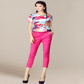 搭配看点:玫红色搭配同色系上衣也十分出众,统一的色系十分协调,也很有渐变的美感,像模特这样选择一款收腰拼接荷叶边下摆的印花上衣就十分美艳。