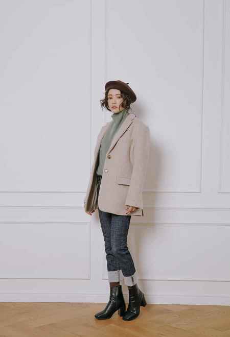 懂得像韩国女孩一样正确利用佩饰,复古感毛呢小外套搭配直筒牛仔裤高卷裤腿自然又随性。脚上的方头短靴与外套相互呼应,内搭高领衫女人味十足。整体造型娘man风格平衡的很好,文艺范贝雷帽增加细节感的同时又彰显文艺温柔气质。