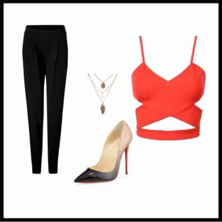 全身搭配:黑色哈伦裤+红色绑带款背心+渐变红底尖头高跟+多层项链