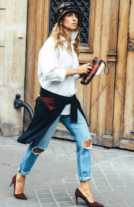 白色oversize衬衫和破洞牛仔裤的极简主义搭配麂皮酒红色高跟鞋营造女人味,腰间系上外套提高腰线,在视觉上拉长双腿,平衡“男友力”,亮片式渔夫帽为造型增加复古时髦感。
