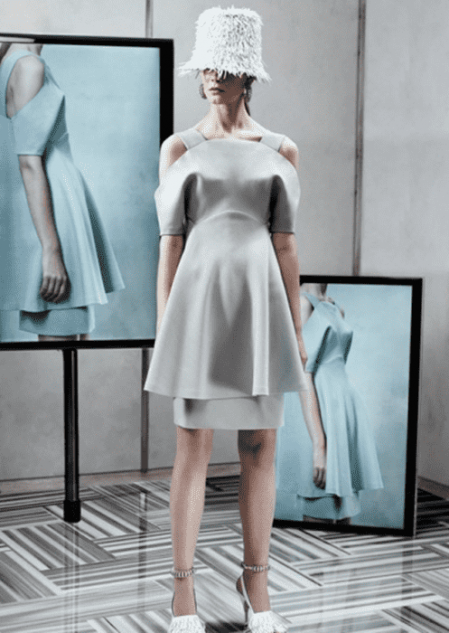 用碎塑料条装饰的白色渔夫帽令人意外的惊喜,这奇思妙想之作搭配肩膀垂下并向后延伸的裙装,前面看上去合身优雅,背后宽松轻盈,塑造优雅又经典的西班牙海港名媛形象。