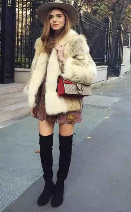奶白色皮草+烟粉色连身裙+黑色过膝筒靴
