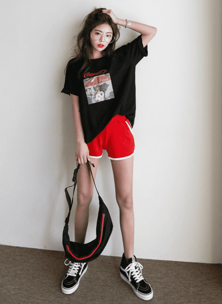 运动裤不用说了把,T恤的运动气息和运动短裤相撞,运动感满满~可以选择黑色的另一cp红色~会更加活力满满哟~