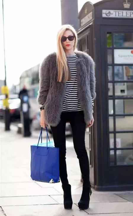 深灰色皮草+黑白条纹上衣