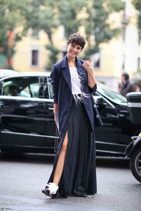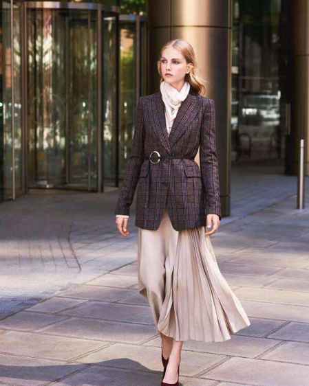 如果觉得西装外套太过严肃,**可以搭配一条百褶裙,就能轻松打破。还可以搭配紧身针织裙,这样的穿搭除了干练外也很具有文艺范儿,也会更有小女人的温柔气质。