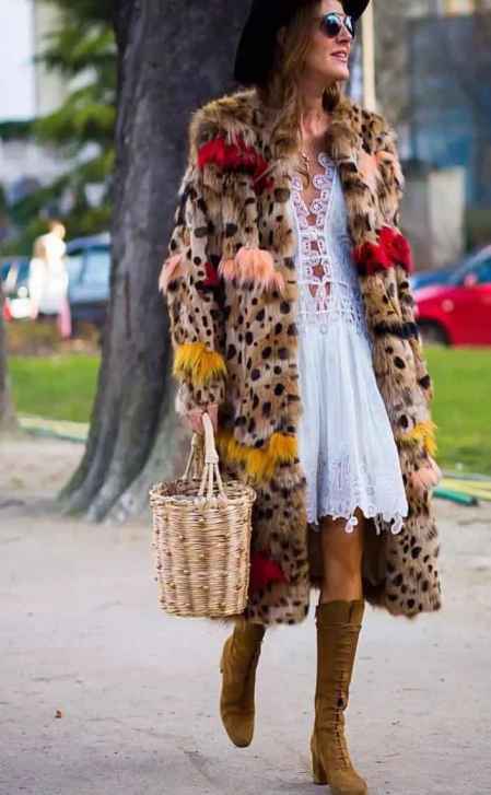将编织篮作为包包并不是罕见的配搭,毕竟充满了自然的气息,而且清新的感觉给气场强大的豹纹皮草带来一丝田园风情,不过不可以选择太饱满的尺寸,不然就会真的像拎着一个菜篮子一般。