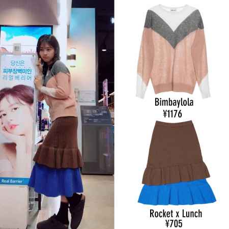 她下面配了条荷叶边拼色针织半裙,都是韩国品牌,比想象中要便宜点。
