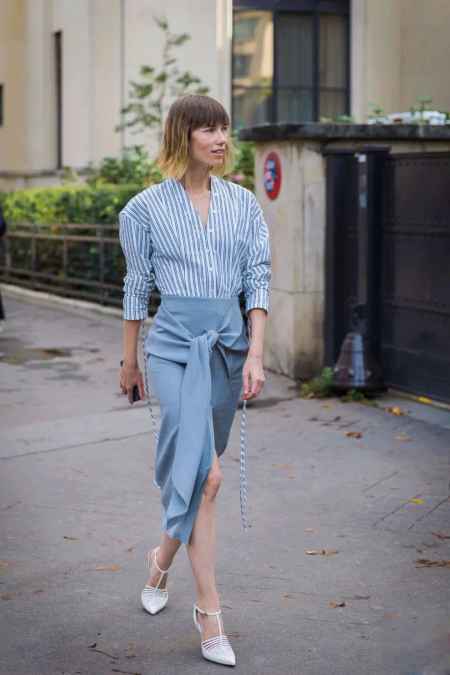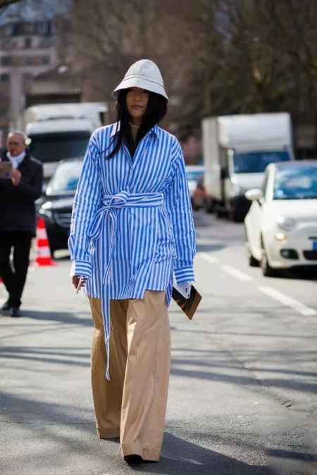 蓝白条纹的衬衫春天穿很是清新,粗一点、宽一点的条纹更醒目一些,加上腰带或者不好好穿都是搭配的技巧。