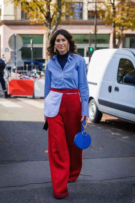 自古红蓝出cp,红蓝撞色很是吸睛抢眼,蓝衬衫内搭小高领增加层次感的穿法很不错。
